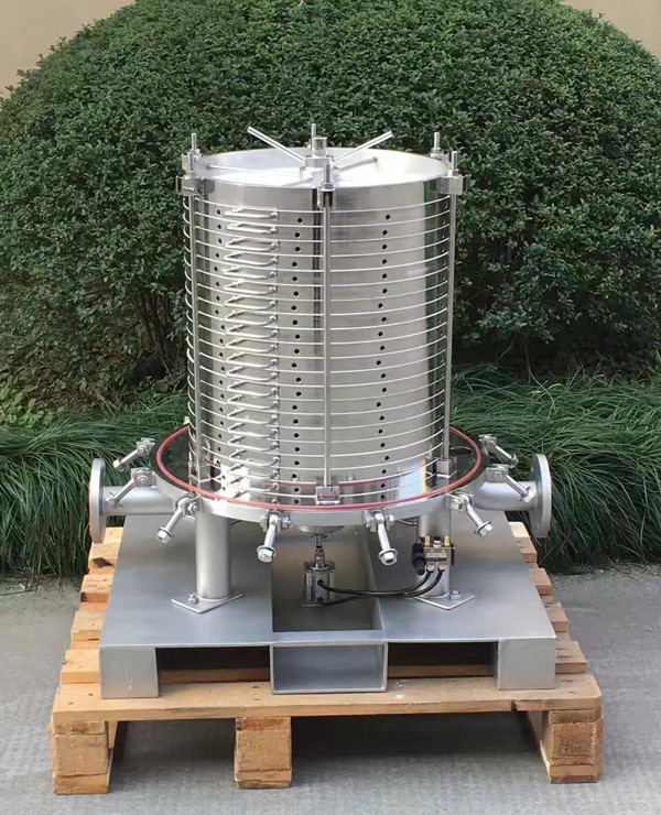 該過濾機是在密閉的筒體內,由若干片水平放置的濾板中間裝夾濾紙組成。它是依靠濾紙作過濾介質,在密閉容器內進行加壓過濾。過濾時,濾液由輸送泵送入過濾體內,沿著濾板外圈周上的小孔進入兩層濾板間,濾液穿過濾紙和多孔支撐板,流入濾板中心孔道,在機體底部出料口流出,過濾精度較高。過濾完后,用壓縮空氣將過濾機內殘液.